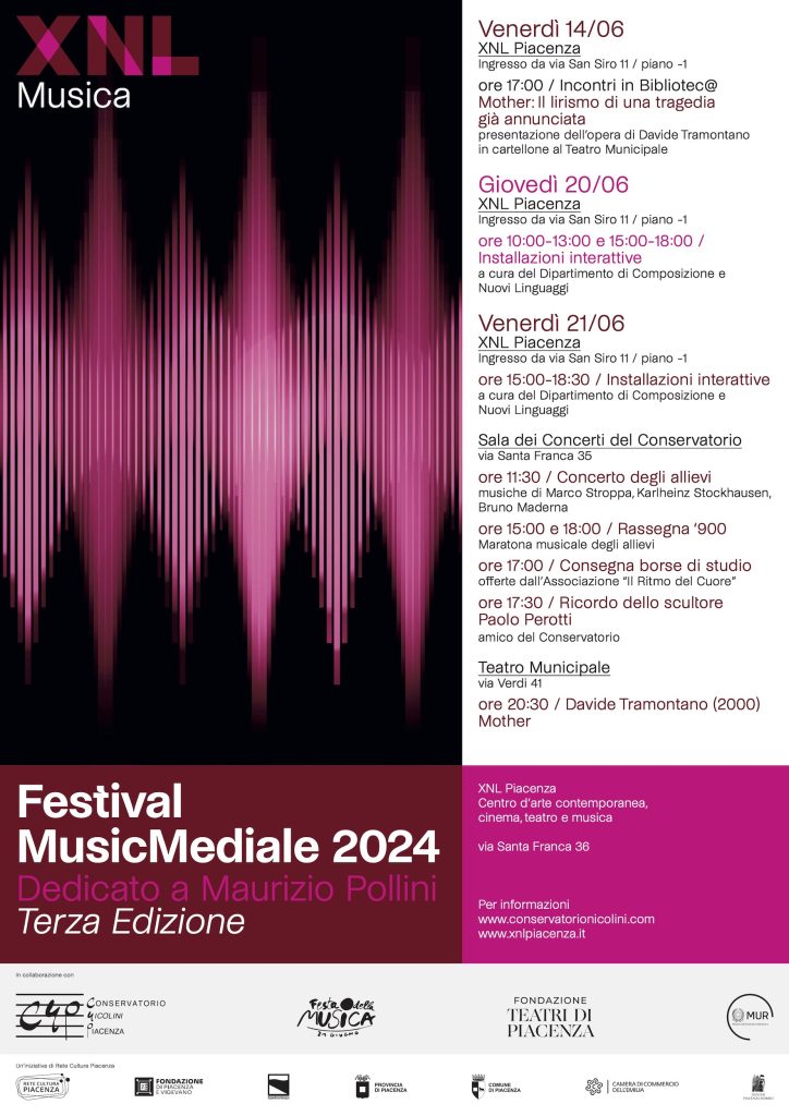 Giunto al suo terzo anno e con un’edizione dedicata alla memoria di Maurizio Pollini, il Festival MusicMediale del Conservatorio “Giuseppe Nicolini” torna il 20 e 21 giugno nel salone concerti del Conservatorio e poi all’interno dei nuovi spazi dedicati alla musica di XNL Piacenza, il Centro per la promozione dei linguaggi contemporanei della Fondazione di Piacenza e Vigevano. Il programma, in continuità col passato, sarà caratterizzato da proposte musicali inedite o comunque legate al Novecento e alla contemporaneità, affiancate da brevi inserti celebrativi.
